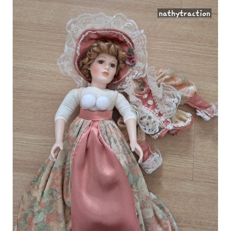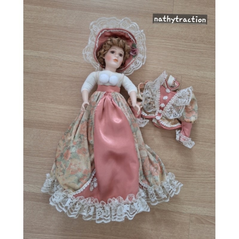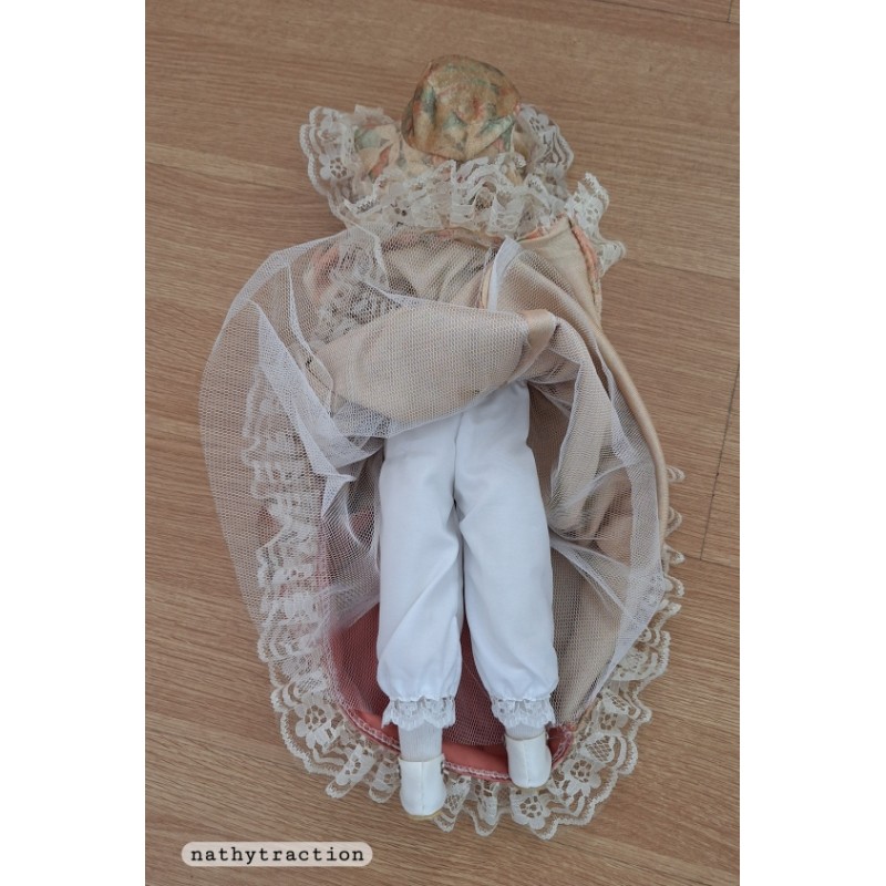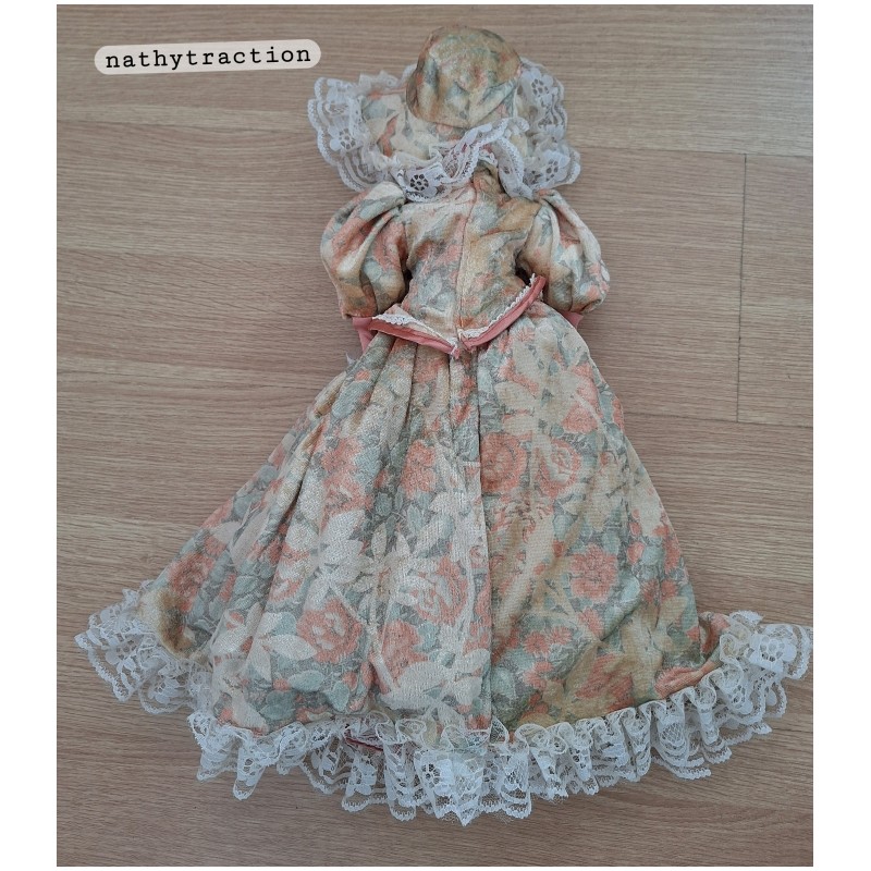 Cette poupée en porcelaine, vêtue d'une robe élégante. Sa robe, aux teintes douces de rose saumon et de fleurs, est ornée de dentelle délicate sur le bas, avec un bord festonné.Un élastique discret à la taille permet à la robe de bien s'ajuster à sa silhouette délicate. Elle porte également une petite veste de dentelle, parée de perles, qui souligne son élégance.
