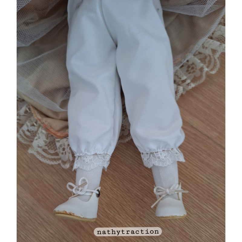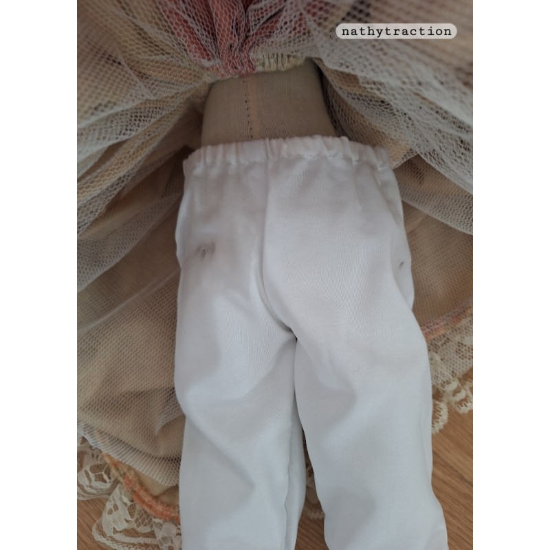 Sous la robe, on aperçoit une culotte blanche en tissu fin, dont deux petites taches noires, probablement dues à des frottements, peuvent être remarquées. Malgré ces petites imperfections, la poupée conserve une grande beauté et une grande finesse. Elle est accompagnée de son socle, permettant de l'exposer avec élégance.