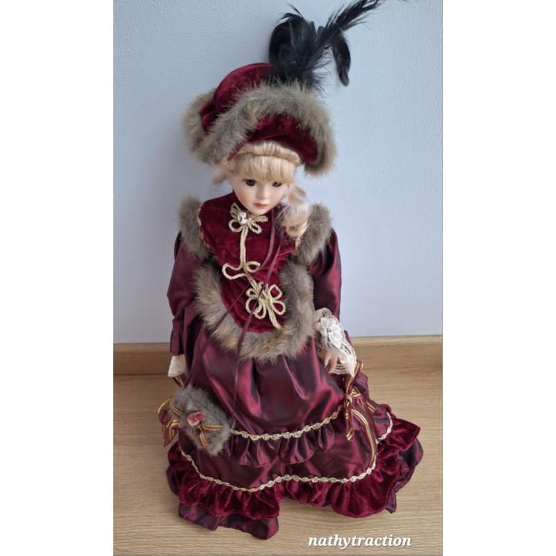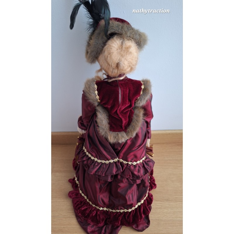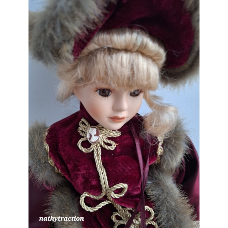 Son visage délicat est sculpté dans de la porcelaine fine, avec des traits doux et un regard expressif. Les cheveux blonds sont finement coiffés en boucles. Robe somptueuse bordeaux, agrémentée de détails dorés et d’un manchon en fourrure.