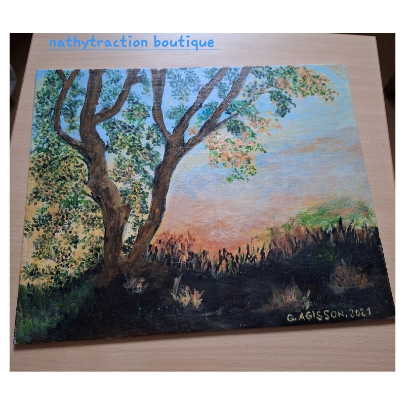Peinture réalisée par une artiste peintre régionale , l'arbre et son coucher de soleil qui est représenté sur une toile cartonnée, peinture acrylique.